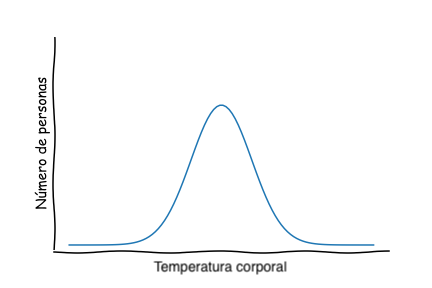 Este gráfico dice que una gran parte de la población tiene una temperatura corporal cernana al promedio, y muy pocas personas tienen temperaturas extremadamente altas o bajas.