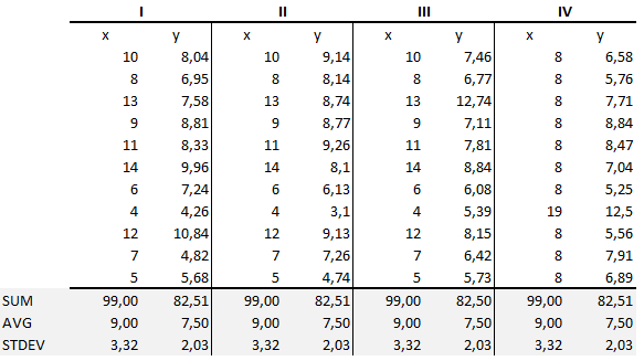 El Cuarteto de Anscombe consiste en 4 conjuntos de datos con valores diferentes, pero propiedades estadísticas idénticas: